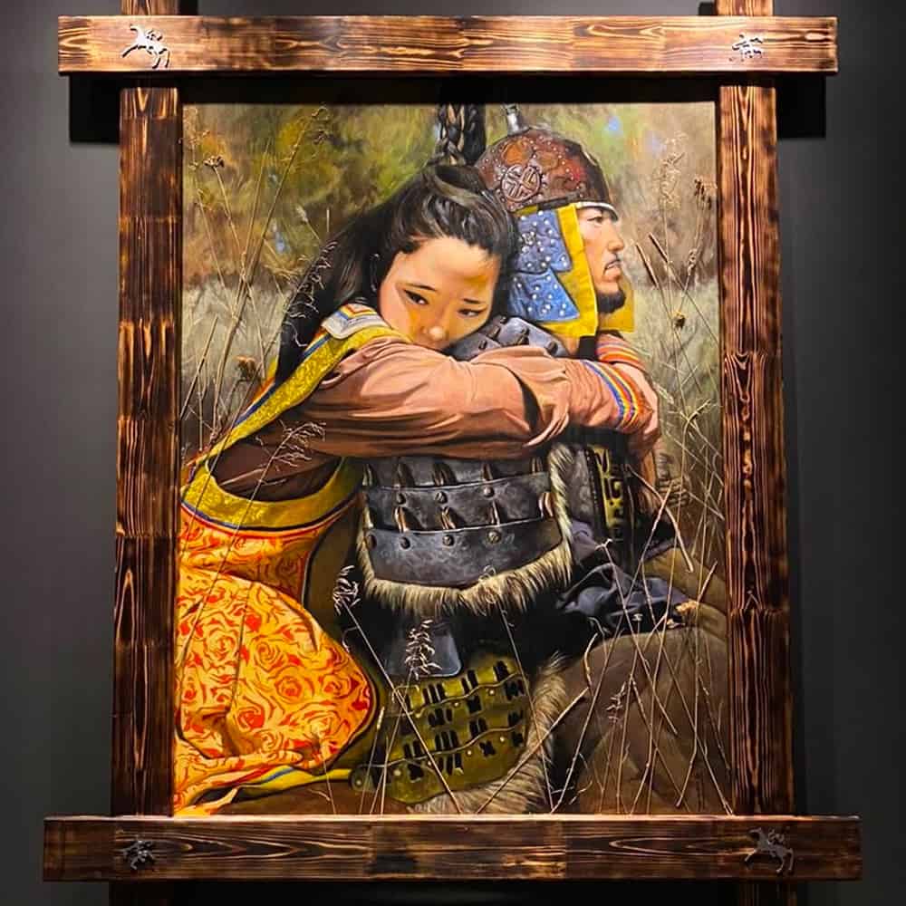 Эта необычная инсталляция представлена в темноте. Только несколько ламп подсвечивают изображение, вокруг звучит романтичная музыка, и всё это словно оживляет героев картины: девушка в алтайской национальной одежде крепко обнимает своего возлюбленного — молодого воина в тюркских доспехах. Сцена погружает зрителя в их внутренний мир — заботу и нежность девушки и спокойствие, умиротворение воина. Даже сильному мужчине нужна любовь и нежность близкого человека.